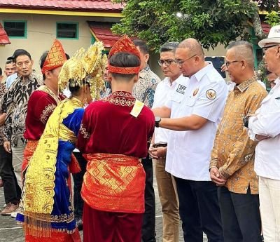 Kepala SMP Negeri 14 Kota Binjai, Edi Salim Chaniago, asik bernyanyi diiringi instrumen musik One+ Band, saat pembukaan Turnamen Futsal Pewarta Cup, Senin (27/11/2023).