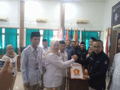 Ketua DPC Partai Hanura Kota Binjai, Zainal Abiddin Nasution SH, didampingi jjaaran pengurus, menyerahkan berkas pendaftaran bacaleg Pemilu 2024 kepada Ketua KPU Kota Binjai, Zulfan Effendi ST, Minggu (14/05/2023).