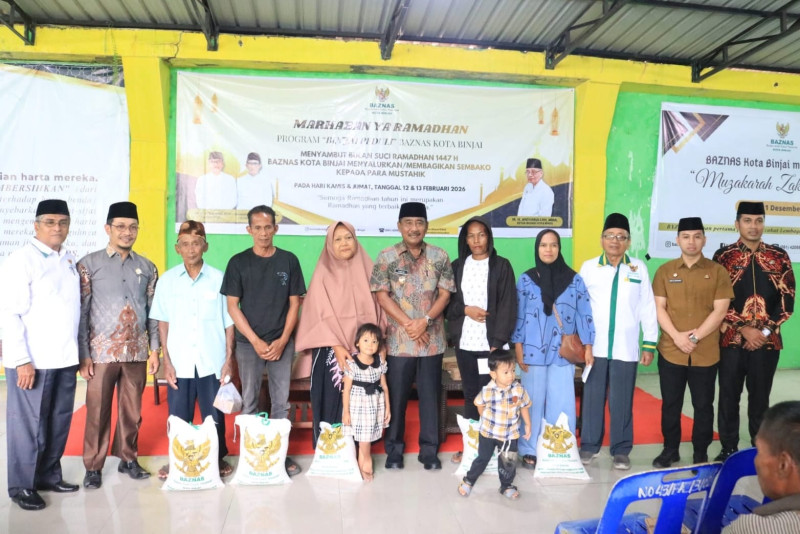 Walikota Binjai, Drs. H. Amir Hamzah, M.A.P., menyerahkan secara simbolis paket bantuan sembako kepada perwakilan mustahik dan petugas kebersihan, Kamis (12/02/2026).