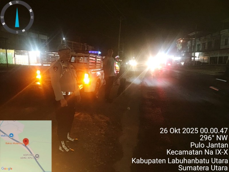 Kegiatan patroli ini dilaksanakan pada Sabtu malam (25/10/25) mulai pukul 23.00 WIB hingga dini hari di dua titik rawan, yakni Jalinsum Pinang Lombang dan Jalinsum Kota Raja, Desa Kampung Pajak, Kecamatan Na IX-X, Kabupaten Labuhanbatu Utara.